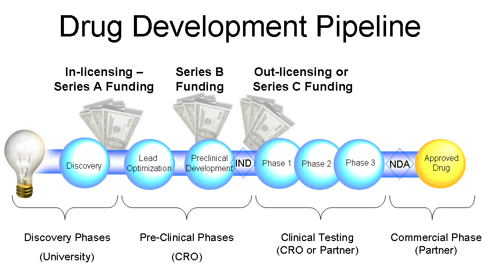 At least three major financial events are common, as shown above the timeline. These incluse the start-up or seed funding to get the project underway, and this round often includes licensing fees to a university or other research organization for their IP on the development target or lead candidate. After the validation of the target and a number of other duties, additional funding is typically needed for the pre-clinical development work, which involves further research and characterization as well as animal testing. Hopefully, at around the time an IND is about to be filed, a larger pharma or biotech partner will license the rights to the drug, resulting in a large up-front payment as a reward for all the hard work and investment. This timing of the licensing event for around the time the IND is filed is intended to avoid the need for the innovator to finance human clinical trials, which can be quite expensive, and is therefore sometimes referred to in biotech financial circles as the "sweet spot" of biotech financing.